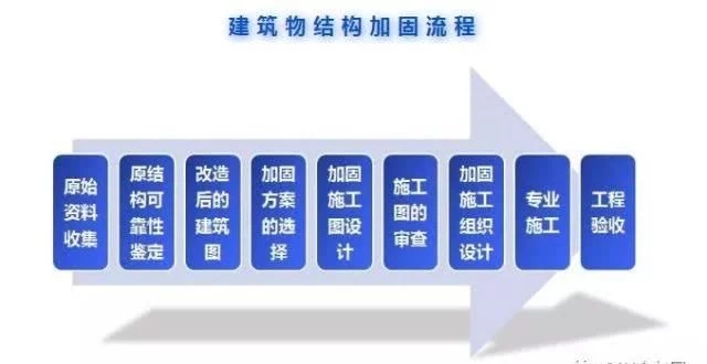 如何按照規范對建筑物進行加固,避免安全事故的發生,參考《混凝土結構加固構造》13G311規定,建筑物進行結構加固必須按照以下流程: